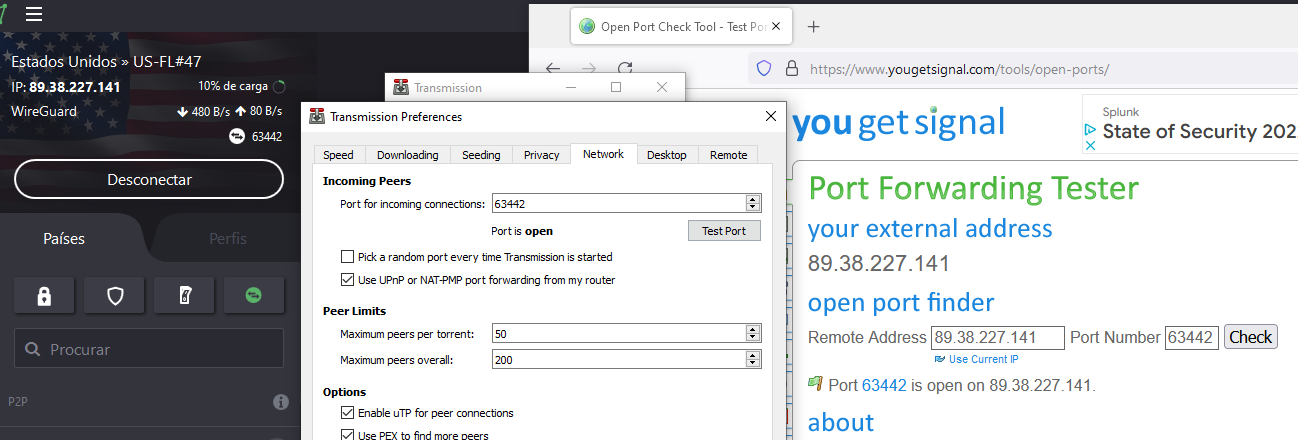 Porten bliver ikke forwarded, ifølge flere portcheckere, f.eks. Mullvad. Jeg tror dette er relateret til det første problem, fordi hvis jeg tjekker, om porten er forwarded til den IP, Proton viser, er den åben og ser ud til at fungere.