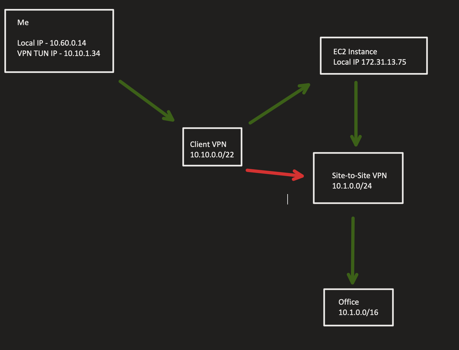 Jeg har statiske ruter for alle de involverede subnets i både S2S-konfigurationen og VPC’en, og jeg er rimelig sikker på, at jeg har konfigureret SG’er for alle relevante steder (EC2 og S2S). Kan du komme i tanke om noget, jeg overser?